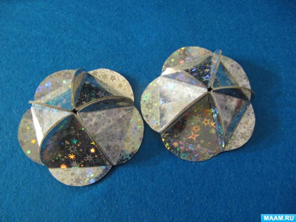 Треугольники в круге, с загнутыми бортами, склеенными между собой – это своего рода классика. Сделать такой шарик несложно, но радовать своим видом он будет не хуже фабричных игрушек.